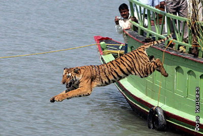 Индийские спасатели отпускают на волю спасенную беременную тигрицу, которая была найдена избитой в одной из деревень в 150 км от Калькутты