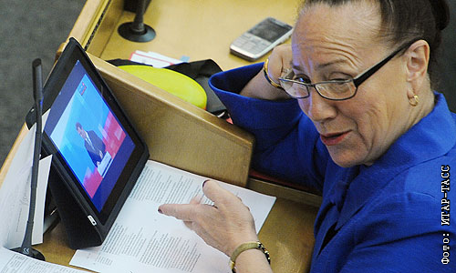 Зампредседателя комитета Госдумы по труду и социальной политике Фарида Гайнуллина во время пленарного заседания Госдумы РФ смотрит трансляцию пресс-конференции президента РФ Дмитрия Медведева