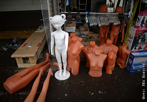 Манекены в палатке на территории торгового центра "Садовод" в Москве.