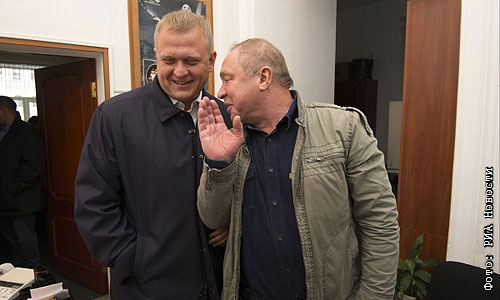 Руководитель департамента культуры Москвы Сергей Капков (слева) во время посещения театра "Школа современной пьесы" после пожара. Справа - художественный руководитель театра "Школа современной пьесы Иосиф Райхельгауз.