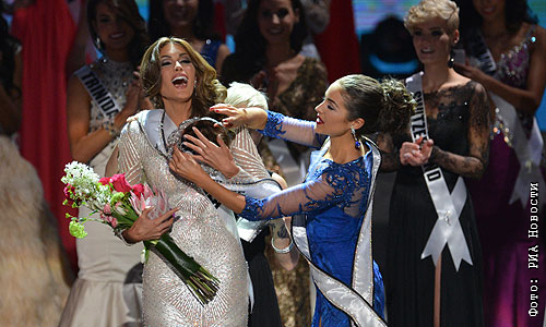 Победительница конкурса "Мисс Вселенная 2013" из Венесуэлы Габриэла Ислер (слева) и "Мисс Вселенная – 2012" Оливия Калпо на церемонии награждения в Крокус Сити Холле.