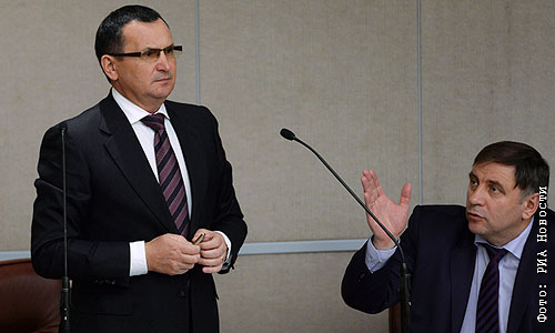 Министр сельского хозяйства РФ Николай Федоров (слева) и статс-секретарь - заместитель министра сельского хозяйства РФ Александр Петриков на пленарном заседании Государственой Думы РФ.