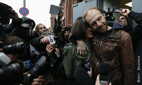 Фотограф Денис Синяков, отпущенный из-под стражи под залог в 2 миллиона рублей, с супругой Алиной у СИЗО №1 в Санкт-Петербурге. Синяков был задержан вместе с активистами Greenpeace и членами экипажа ледокола Arctic Sunrise при попытке высадится на платформу "Приразломная" в Печорском море.