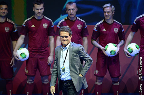 Игроки сборной России по футболу Дмитрий Тарасов, Денис Глушаков, Игорь Акинфеев, Александр Самедов и Федор Смолов (справа налево) на презентации новой формы национальной команды от Adidas, в которой россияне будут выступать на чемпионате мира 2014 года в Бразилии, в концертном зале "Барвиха Luxury Village".