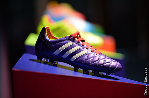 Образцы бутс от Adidas, представленные на презентации новой формы сборной России по футболу, в которой команда будет выступать на чемпионате мира 2014 года в Бразилии, в концертном зале "Барвиха Luxury Village".