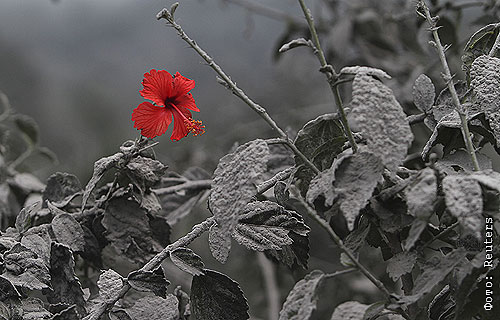 Цветок гибискуса в северном районе Суматры, где происходит извержение вулкана.