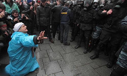 Сотрудники правоохранительных органов и сторонники евроинтеграции во время столкновения у здания Кабинета министров в Киеве.