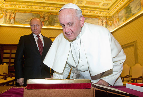 Президент России Владимир Путин во время встречи с Папой Римским Франциском в Апостольском дворце Ватикана.