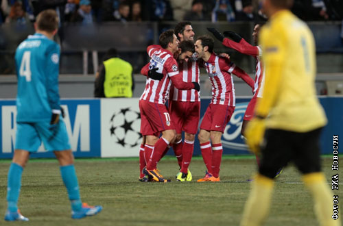 Игроки "Атлетико" раудются забитому мячу в ворота "Зенита" в матче группового этапа Лиги Чемпионов УЕФА между ФК "Зенит" (Санкт-Петербург) и ФК "Атлетико" (Мадрид).