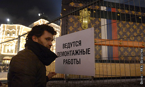 Демонтаж конструкций павильона-чемодана Louis Vuitton, установленного на Красной площади в Москве.