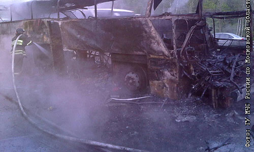 В результате столкновения автобуса "Неоплан" и грузовика "КАМаЗа" в Подмосковье погибли 11 человек. Автобус выгорел дотла