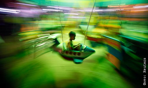 Ребенок кружится на карусели на ярмарке в Янгоне.