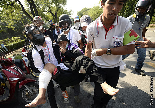 Полиция вновь вступила в столкновения с демонстрантами близ здания правительства в столице Таиланда Бангкоке. Стражи порядка, охраняющие правительственные учреждения, применили против протестующих слезоточивый газ. Демонстранты бросали в полицейских камни и другие предметы. По меньшей мере 55 человек были госпитализированы в результате столкновений, произошедших в столице накануне и в понедельник. Они были помещены в пять различных больниц Бангкока.