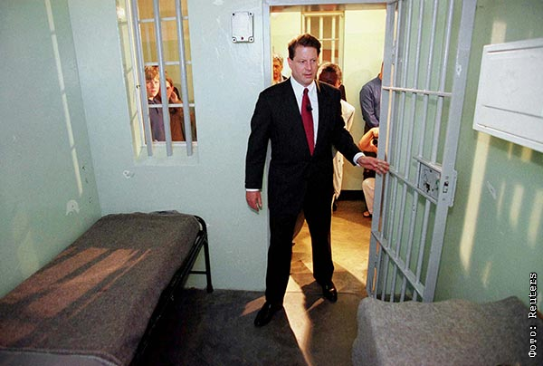Ал Гор в камере, в которой Мандела провел 27 лет заключения.