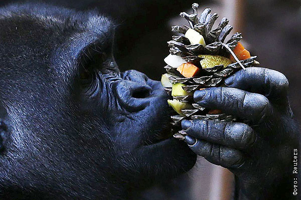 Горилла есть "фруктово-овощную шишку" в частном семейном зоопарке Palmyre Zoo на западе Франции.