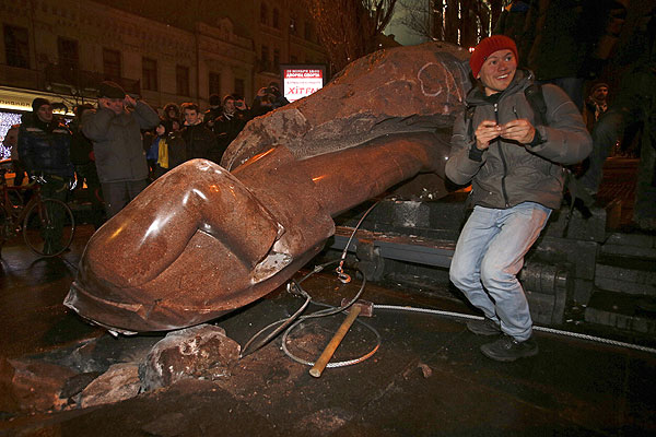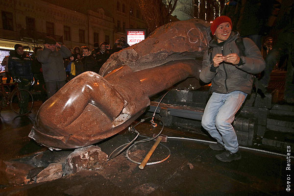 Группа неизвестных людей в воскресенье вечером снесла памятник Ленину с пьедестала, сообщили агентству "Интерфакс-Украина" в пресс-службе столичной милиции. "Группа неизвестных людей в масках окружила памятник Ленину. Они жгли фаеры, а потом завалили памятник", - рассказали в милиции.