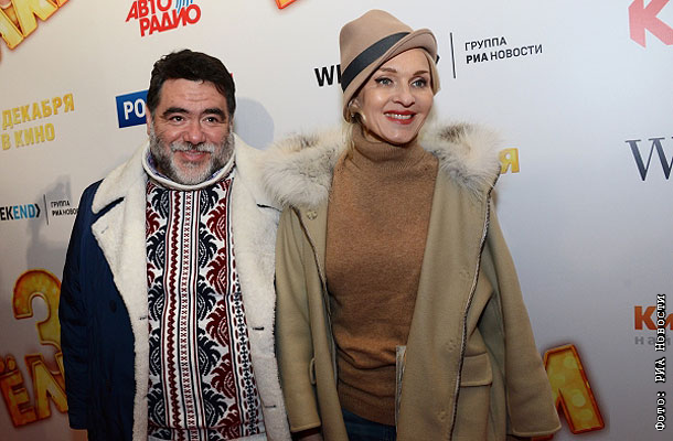 Российский бизнесмен Михаил Куснирович с супругой Екатериной перед премьерой фильма "Елки 3" в кинотеатре "Каро Фильм Октябрь" в Москве.