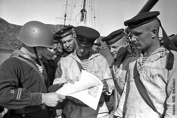 Великая Отечественная война 1941-1945 годов. Моряки одного из кораблей читают свежий номер газеты со сводкой Советского Информбюро. 1941 год. Фотография Эммануила Евзерихина. Основной задачей Бюро стало составление сводок для радио, газет и журналов о положении на фронтах, работе тыла, о партизанском движении во время войны.