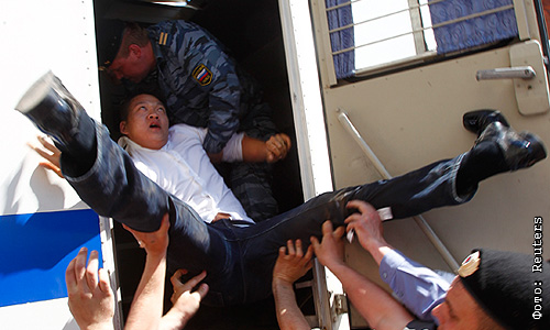 Активист из США Дэн Чой (в центре), задержанный на несанкционированном гей-параде на площади Революции.