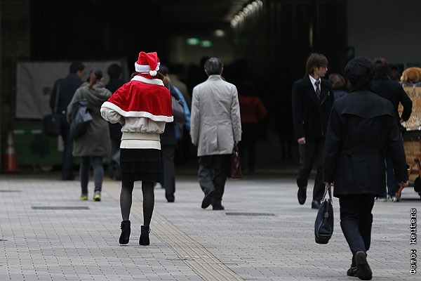 Девушка в накидке и шапке Санта Клауса на одной из улиц Токио.