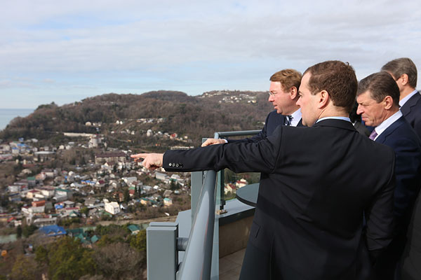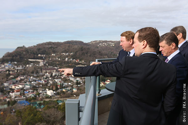 Председатель правительства РФ Дмитрий Медведев (на первом плане) во время осмотра открытого после капитальной реконструкции оздоровительного комплекса "Дагомыс" в Сочи. Слева направо на втором плане - управляющий делами президента РФ Владимир Кожин, заместитель председателя правительства РФ Дмитрий Козак.
