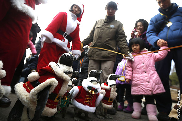 В Южной Корее в городе Йонгин в честь приближающегося Рождества пингвинов нарядили в костюмы Санта Клауса и рождественской елки.