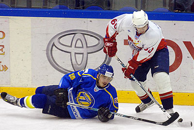 Игроки "Химика" Андрей Страхов и "Металлурга" Томаш Ролинек (слева направо) в матче чемпионата КХЛ: "Химик" (Московская область) – "Металлург" (Магнитогорск) – 1:0