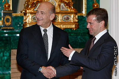Премьер-министр Израиля Эхуд Ольмерт и президент России Дмитрий Медведев (слева направо) на встрече в Кремле