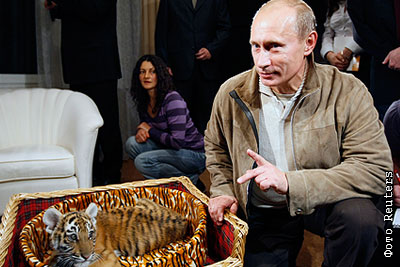 Премьер-министр Владимир Путин показывает подаренного тигренка журналистам в Ново-Огарево. Маленькая тигрица вскоре будет помещена в зоопарк
