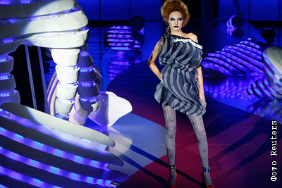 Модель демонстрирует творение Украинского дизайнера Громовой в рамках показа на Неделе моды в Киеве