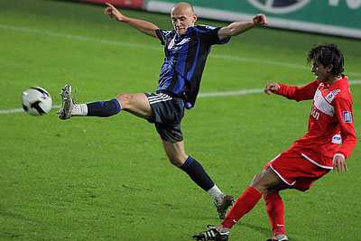 Игроки "Сатурна" Руслан Нахушев и "Спартака" Кристиан Майдана (слева направо) в матче чемпионата России по футболу: "Сатурн" (Московская область) - "Спартак" (Москва) - 0:0