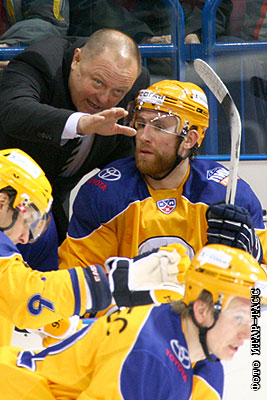 Главный тренер "Атланта" Федор Канарейкин и игрок команды Дмитрий Власенков (слева направо на втором плане) в матче чемпионата КХЛ: "Металлург" (Магнитогорск) – "Атлант" (Московская область) – 5:5 (1:0 по буллитам)