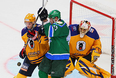 Игроки "Атланта" Вадим Хомицкий,(слева), вратарь Рэй Эмери (справа) и "Салавата Юлаева" Александр Радулов в матче чемпионата КХЛ: "Салават Юлаев" (Уфа) - "Атлант" (Московская область) - 3:5