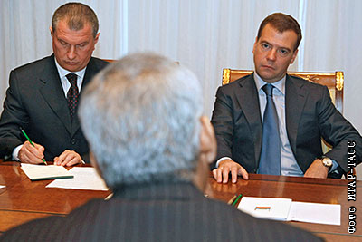 Вице-премьер правительства РФ Игорь Сечин и президент России Дмитрий Медведев на встрече с генеральным секретарем ОПЕК в подмосковной резиденции Горки