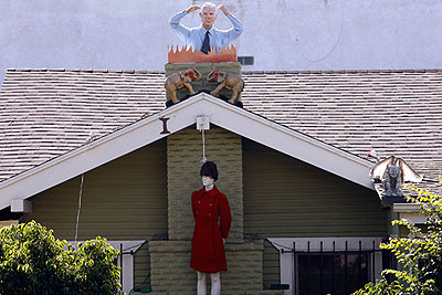Житель Калифорнии украсил свой дом висящим манекеном, одетым как Сара Пэйлин, а на крыше разместил фигуру человека, вылезающего из горящей трубы и похожего на Джона Маккейна