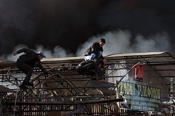 Молодые люди снимают пластиковое покрытие с павильона во время пожара на центральном рынке "Беркат" в Грозном.