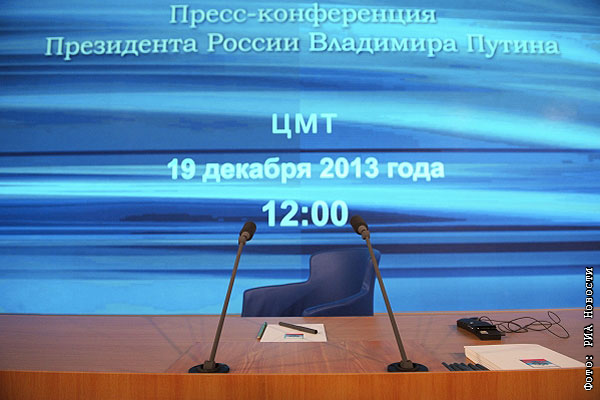 19 декабря 2013. Место для президента России Владимира Путина перед началом большой ежегодной пресс-конференции в Центре международной торговли на Красной Пресне.