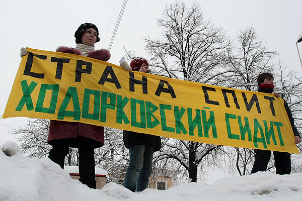 Жители Санкт-Петербурга принимают участие в митинге в защиту экс-главы "ЮКОСа" Михаила Ходорковского и бывшего главы МФО "МЕНАТЕП" Платона Лебедева на Пионерской площади в Санкт-Петербурге.