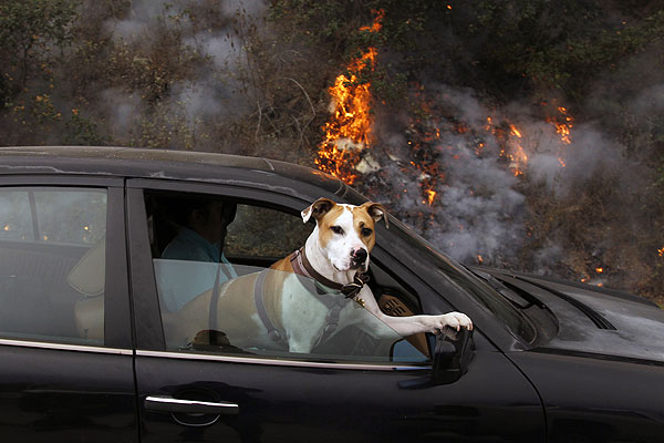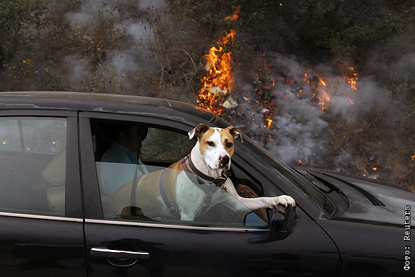 Собака выглядывает из окна автомобиля по дороге из Пфайффер Ридж в Калифорнии, который терпит бедствие от последствий лесных пожаров.