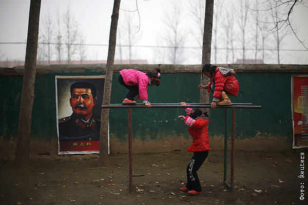 Школьницы играют на площадке на фоне портрета Иосифа Сталина в одной из китайских провинций.