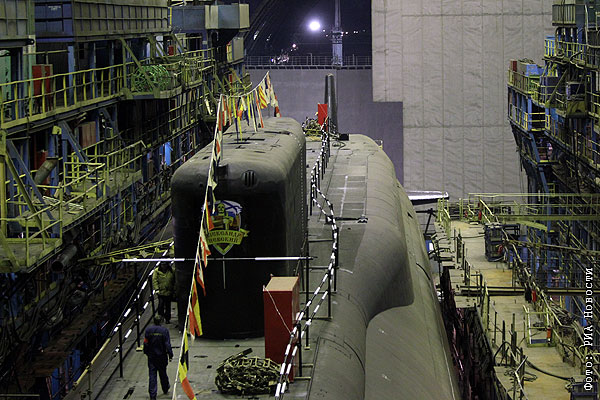 Атомный ракетный подводный крейсер стратегического назначения "Александр Невский" на стапеле завода ОАО "ПО "Севмашпредприятие".