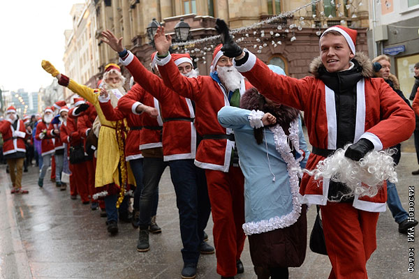 Участники костюмированного шествия Дедов Морозов в центре Москвы.