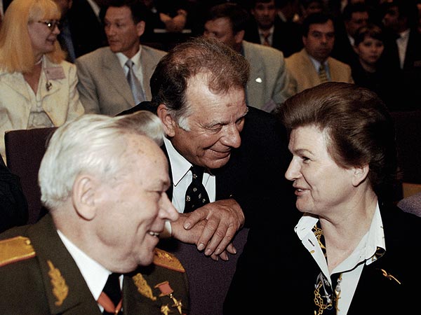 Конструктор стрелкового оружия Михаил Калашников (слева), Лауреат Нобелевской премии в области физики Жорес Алферов (в центре) и первая женщина-космонавт Валентина Терешкова (справа) беседуют на церемонии награждения лауреатов Национальной премии имени Петра Великого.