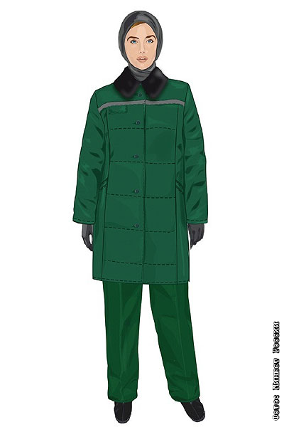 Для холодного сезона предусмотрено простроченное квадратами полупальто с воротником из искусственного меха, прямые брюки, теплый платок для головы, перчатки и утепленные ботинки. Вся верхняя одежда для слабого пола имеет зеленый окрас.