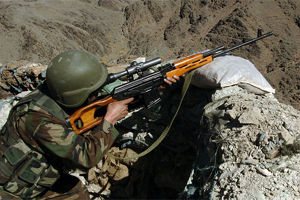 Разработанная на основе РПК и АКМ румынская снайперская винтовка PSL в руках афганского военнослужащего. PSL часто путают со снайперской винтовкой Драгунова, выпускавшейся для Вооруженных сил СССР.