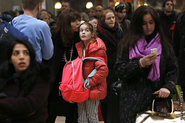 Мама целует дочь на станции Пэддингтон в центральном Лондоне. Десять британских железнодорожных компаний предупредили о значительных задержках поездов в связи с упавшими на рельсы деревьями и обрушившимися линиями электропередачи.