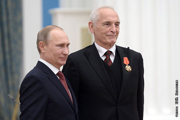 Владимир Путин и актер Василий Лановой, награжденный "Орденом Александра Невского", во время церемонии вручения государственных наград Российской Федерации в Кремле.