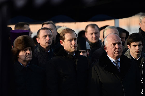 Глава Республики Удмуртия Александр Волков, министр промышленности и торговли РФ Денис Мантуров и генеральный директор Государственной корпорации "Ростехнологии" Сергей Чемезов (слева направо) во время похорон конструктора стрелкового оружия Михаила Калашникова на центральной аллее пантеона Героев Федерального военно-мемориального кладбища в Мытищах.