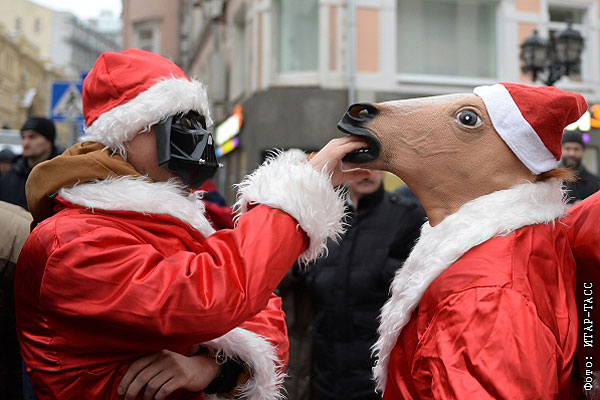 Костюмированный флеш-моб Дедов Морозов в центре Москвы в районе Кузнецкого моста.