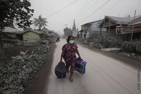 "Самоэвакуация" по-индонезийски. Жительница Суматры спасается от вулкана Синабунг.